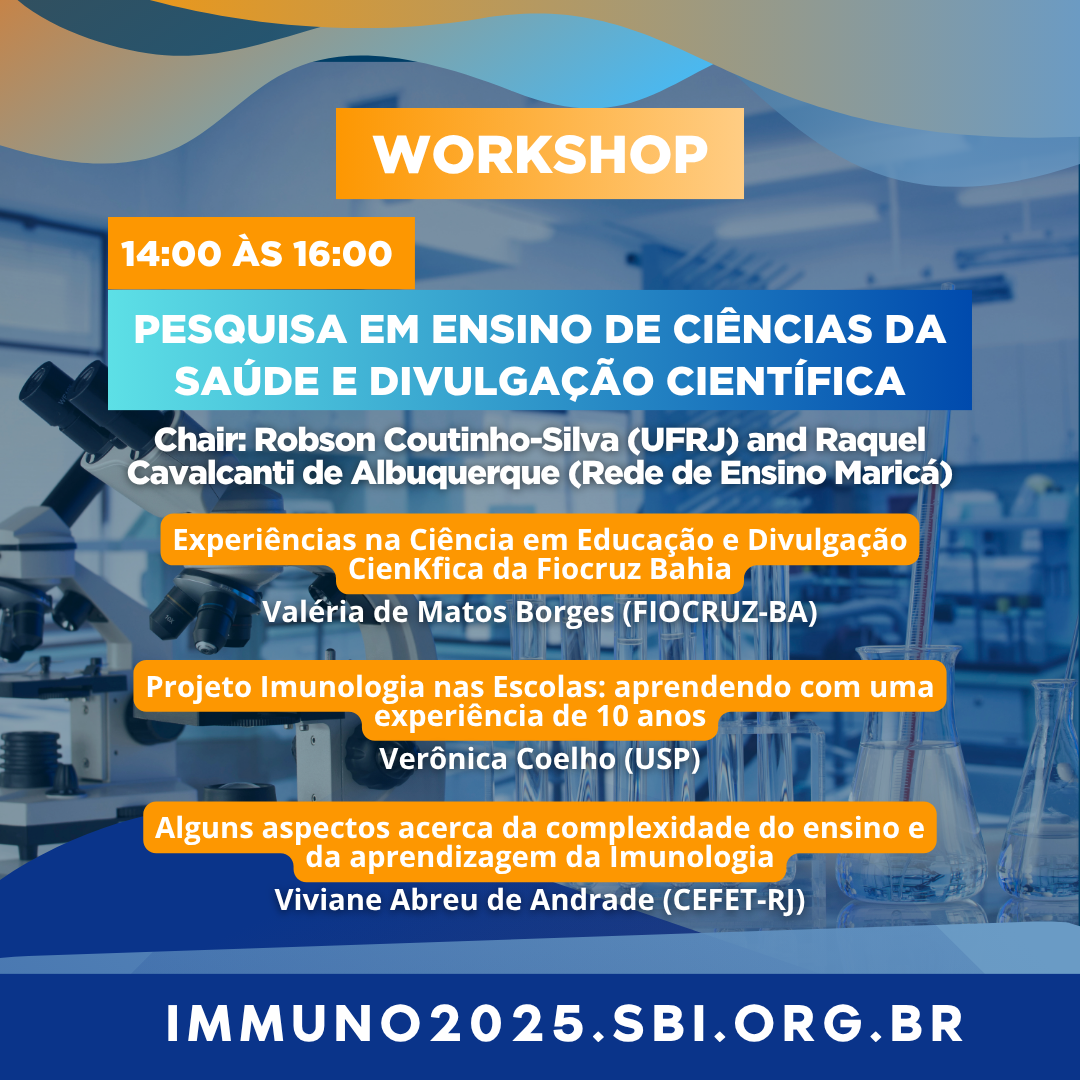 Serão momentos de aprendizado e troca de experiências, com workshops e atividades práticas sobre ensino de Imunologia, pesquisa em ciências da saúde e divulgação científica, conduzidos por professores e pesquisadores de destaque.