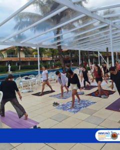 A manhã do dia 13 foi marcada pela realização da primeira aula de yoga aberta à comunidade da SBI. A aula foi ministrada pela Profa. Dra. Karina Bortoluci, presidente eleita da SBI (gestão 2026–2027), proporcionando uma oportunidade de movimentar o corpo e preparar a mente para aproveitar ao máximo as trocas durante o congresso.