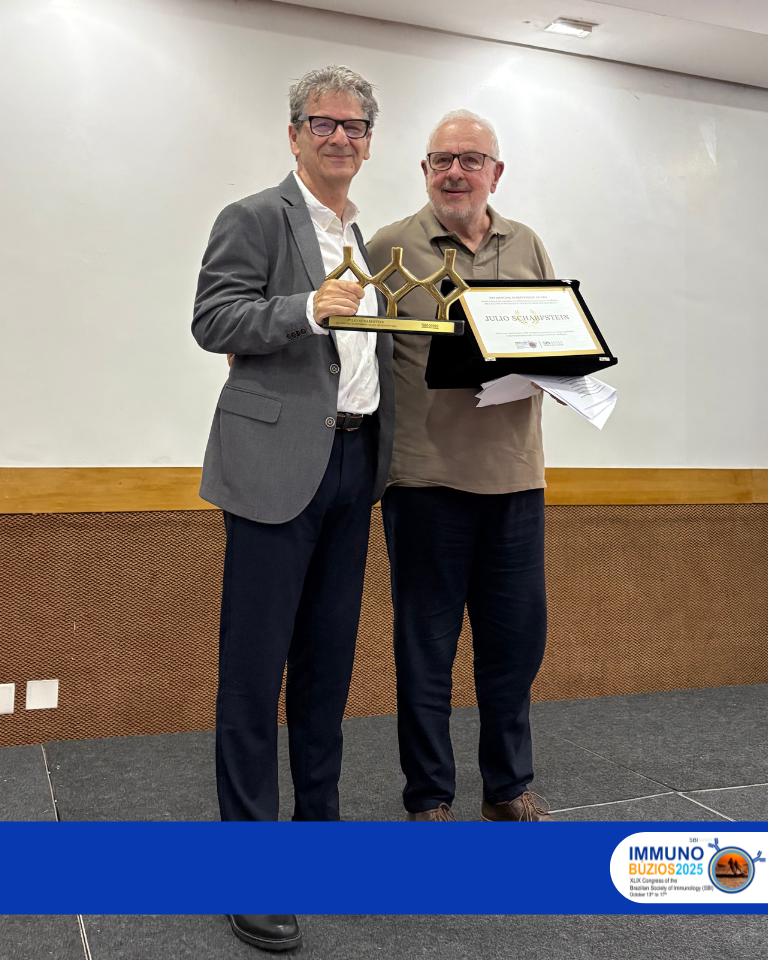 Em seguida o pesquisador Marcello Barcinski (UFRJ) realizou a entrega do “SBI Lifetime Achievement Award In Immunology” ao imunologista Julio Scharfstein (UFRJ).