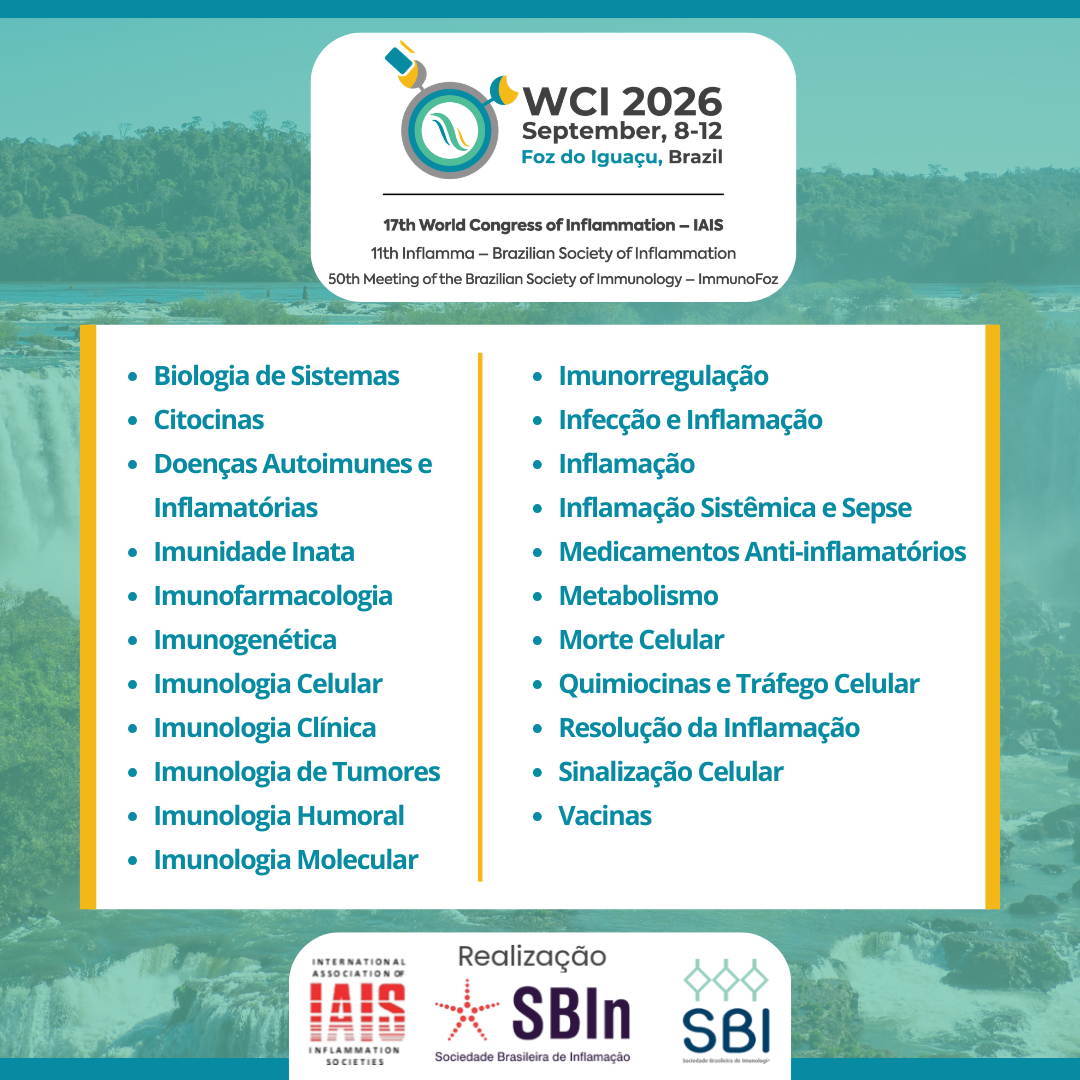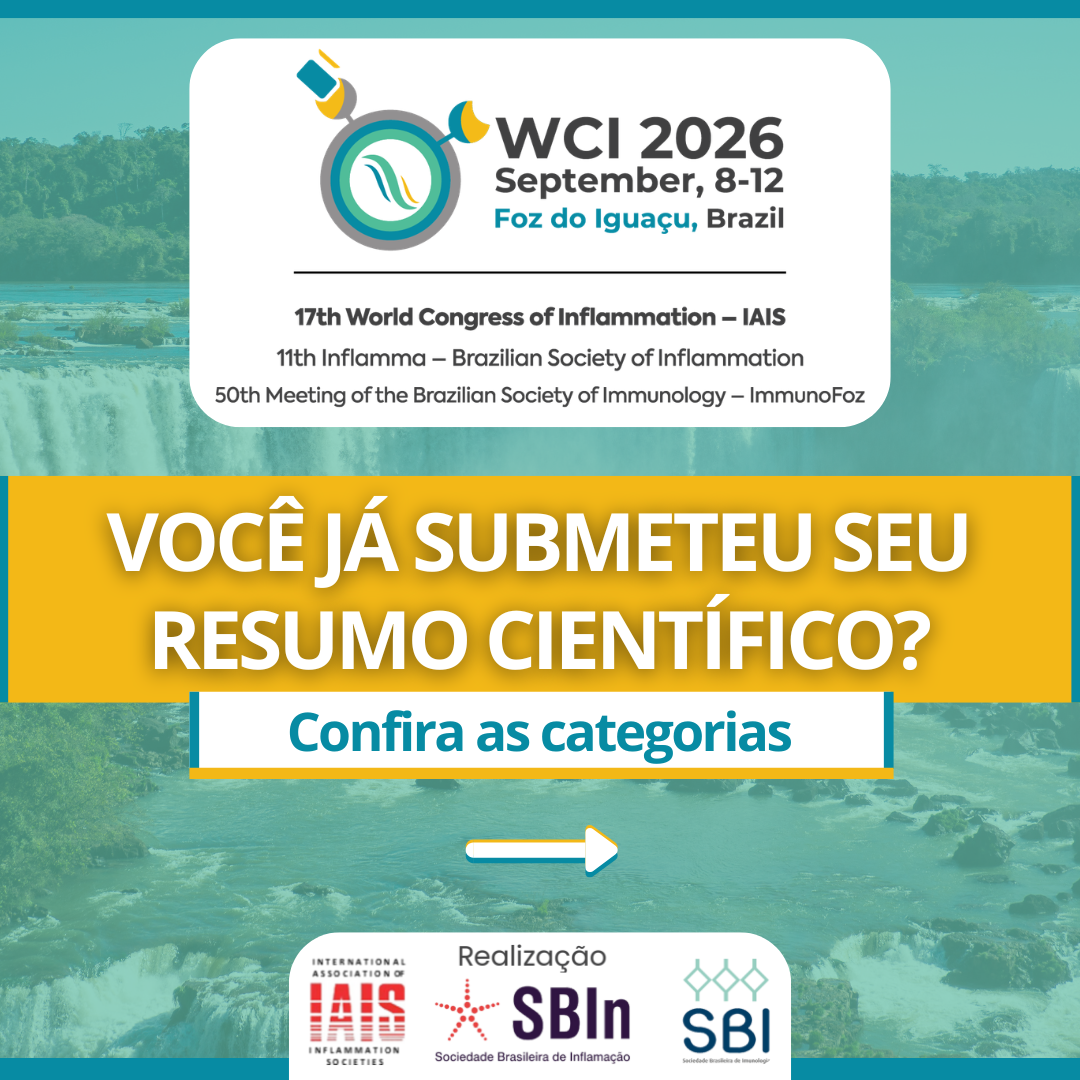 Se você é pesquisador, estudante ou profissional dessas áreas, já pode submeter seu trabalho ao WCI 2026, que reúne três grandes congressos científicos: 17th World Congress of Inflammation (IAIS), o 11th Inflamma – Brazilian Society of Inflammation e o 50th Annual Meeting of the Brazilian Society of Immunology – ImmunoFoz.