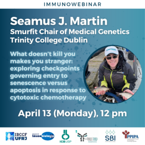 No dia 13 de abril (segunda-feira) acontece o webinar “What doesn’t kill you makes you stranger: exploring checkpoints governing entry to senescence versus apoptosis in response to cytotoxic chemotherapy”, que será ministrado pelo pesquisador Seamus J. Martin (Smurfit Chair of Medical Genetics - Trinity College Dublin).