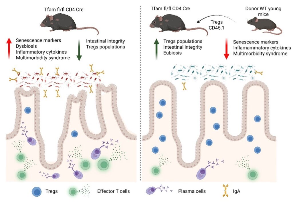 Devido a remodelação considerável dos compartimentos de células T no intestino, os autores avaliaram se a reconstituição de Tregs poderia restaurar a homeostase intestinal e prevenir a síndrome de multimorbidade. A transferência adotiva de Tregs de camundongos jovens CD45.1+ para camundongos receptores CD45.2+ Tfamfl/fl Cd4Cre reequilibrou as respostas de IgA contra bactérias intestinais, preveniu a perda de peso aguda associada à síndrome, reduziu o inflammaging e restaurou a integridade intestinal.